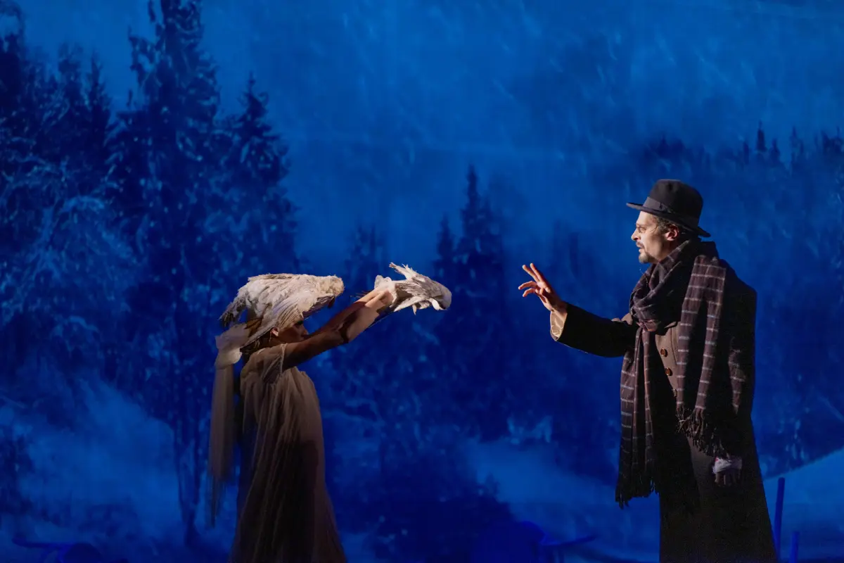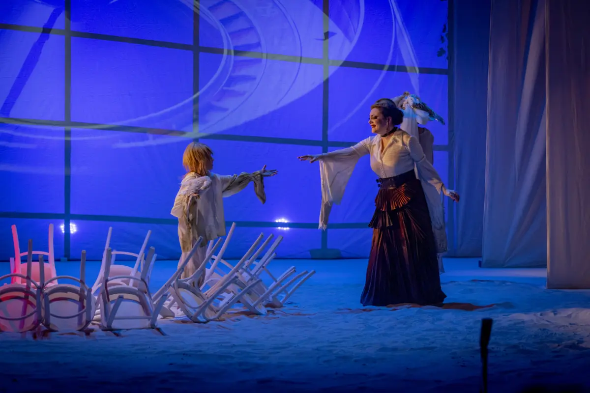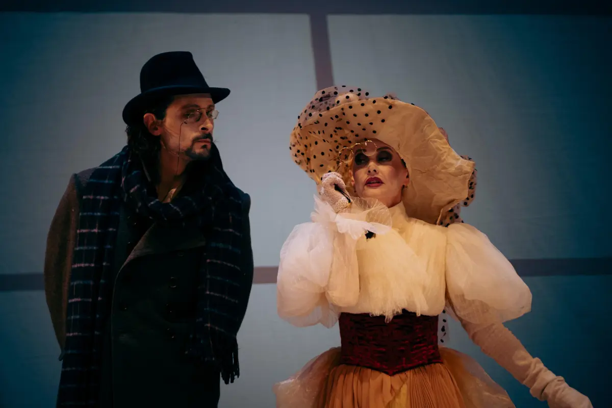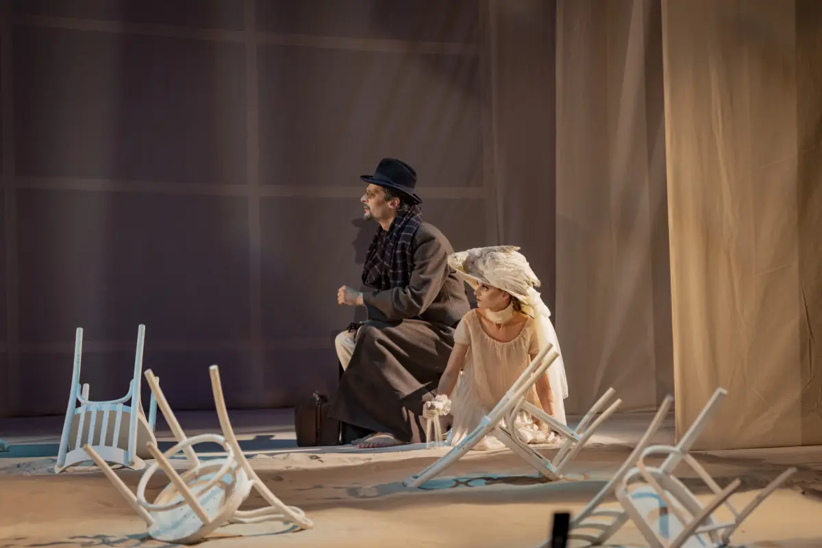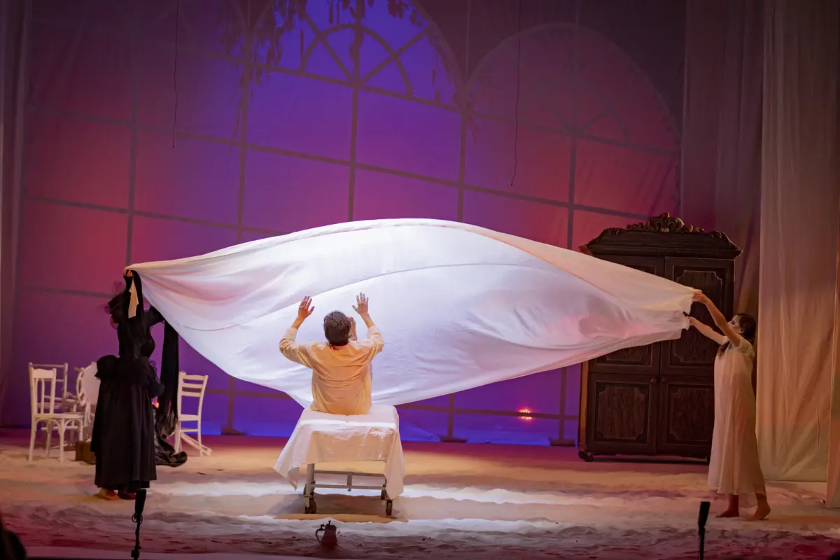 Сценография и костюмы Стеллы Веребчану весьма убедительны и создают атмосферу ирреальной красоты. Прозрачные ткани, шлейфы, шарфы подчеркивают бережную деликатность, с которой творцы постановки относятся к творчеству великого русского драматурга. Он нужен нам сегодня как близкий друг, искренний собеседник, умеющий повеселиться на собственных поминках.
