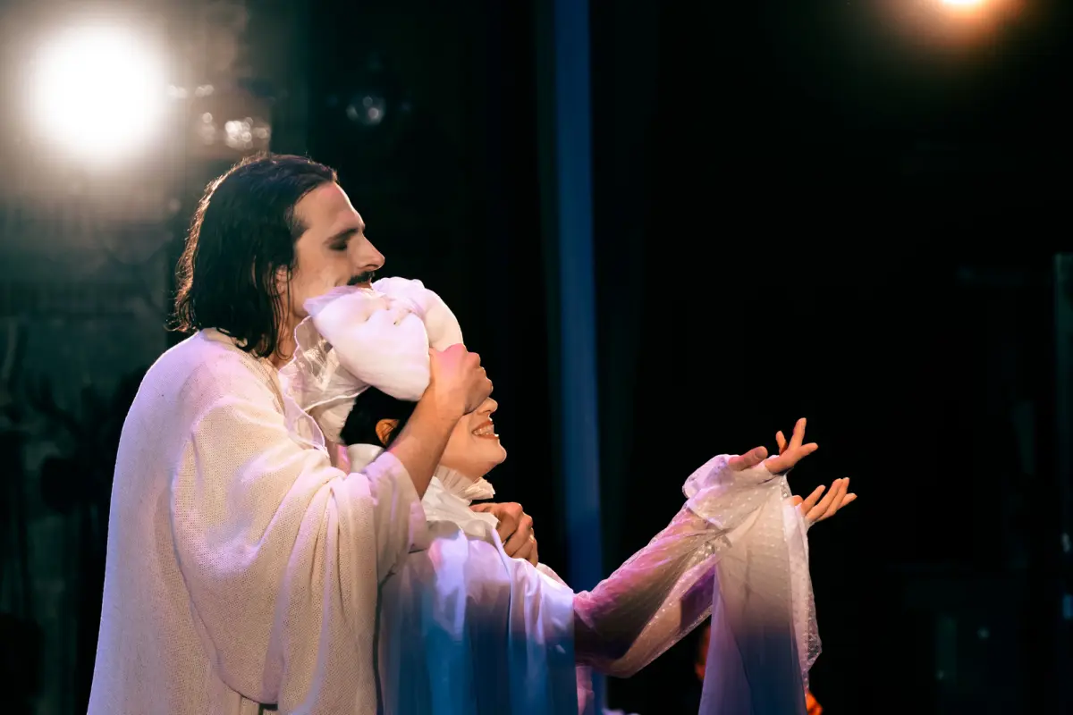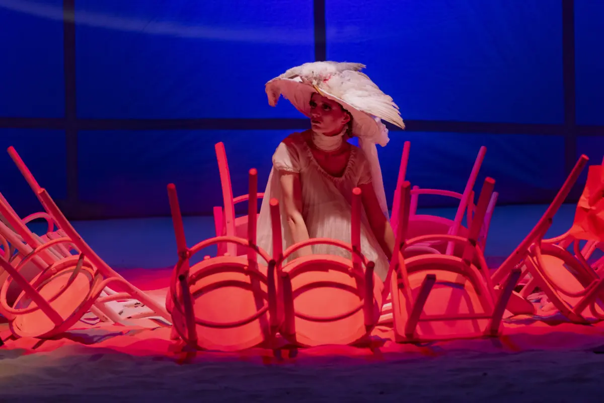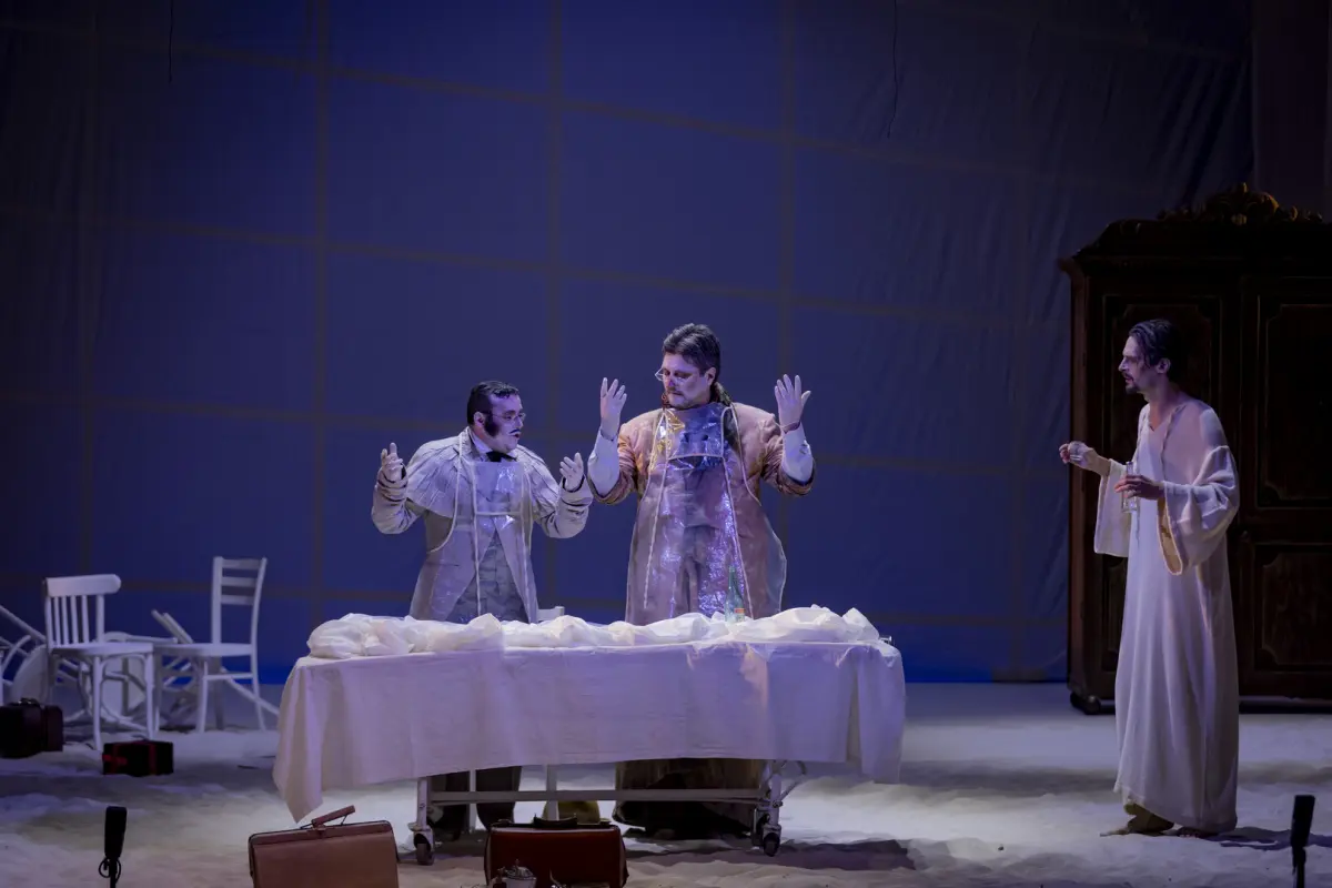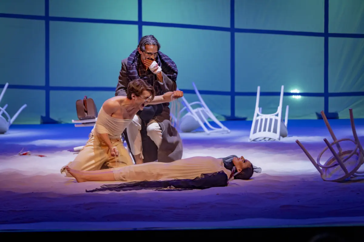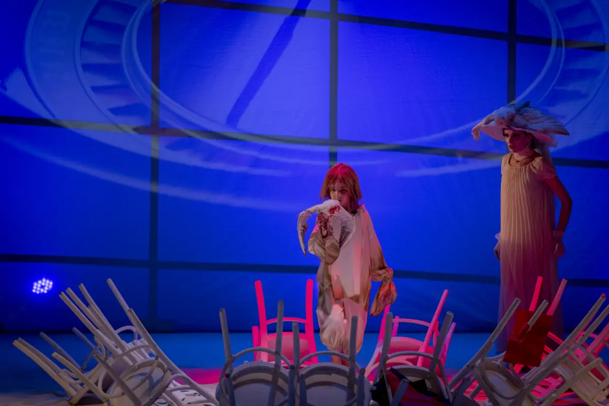 Сценография и костюмы Стеллы Веребчану весьма убедительны и создают атмосферу ирреальной красоты. Прозрачные ткани, шлейфы, шарфы подчеркивают бережную деликатность, с которой творцы постановки относятся к творчеству великого русского драматурга. Он нужен нам сегодня как близкий друг, искренний собеседник, умеющий повеселиться на собственных поминках.
