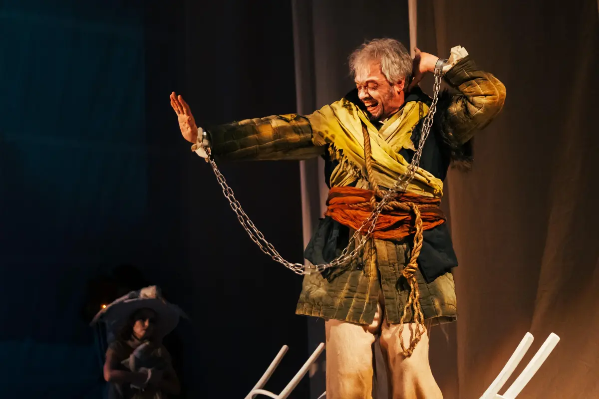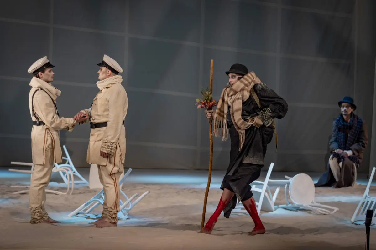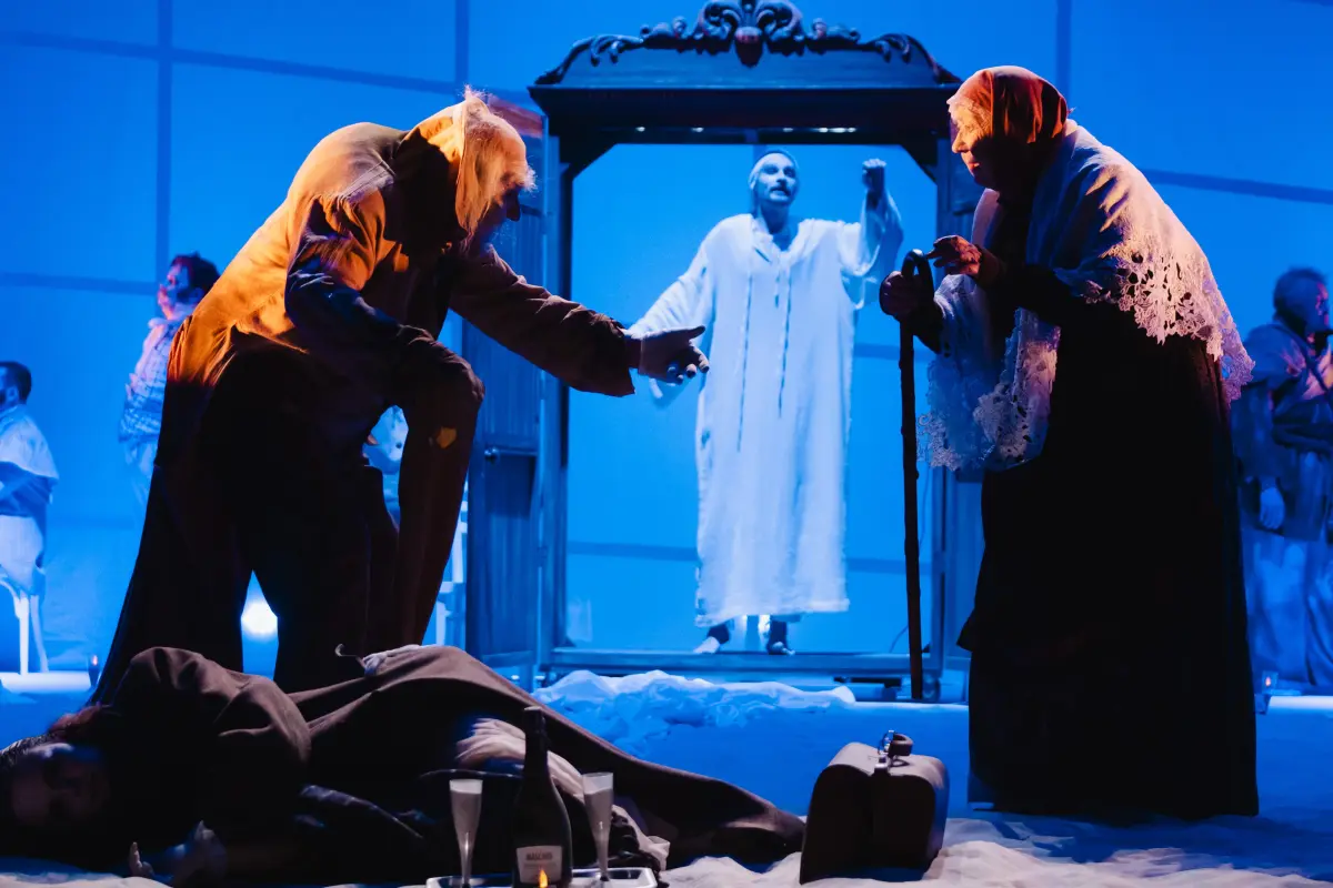 …выделю очень продуманную сценографию. Свет, реквизит, костюмы, звук… Что говорить, когда вся сцена покрыта песком, и все актеры — босиком, а у Прохожего и ноги уже в крови, а он всё идет, и идет!.. И песок на сцене, оказывается, тоже актер, и как он сыграет в финальной схватке со смертью, когда заранее понятно, что та проиграна.